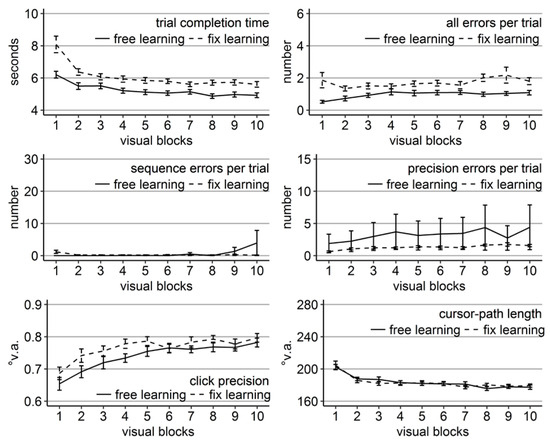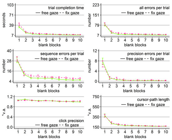 Again, free-gaze participants completed a trial significantly faster with fewer errors of all types (ps < 0.05, except for sequence errors in block 9 with p = 0.06) as confirmed by significant independent sample t-tests. Significantly shorter cursor-paths of the fix-gaze participants were observed in the first five blocks (ps < 0.05). This time, also click precision of the free-gaze participants was higher in some blocks (ps < 0.05 in blocks 2, 4, 6, 7, 9, and 10). Differences were most pronounced early during the learning phase (Figure 6).