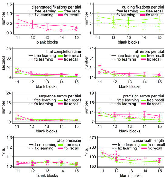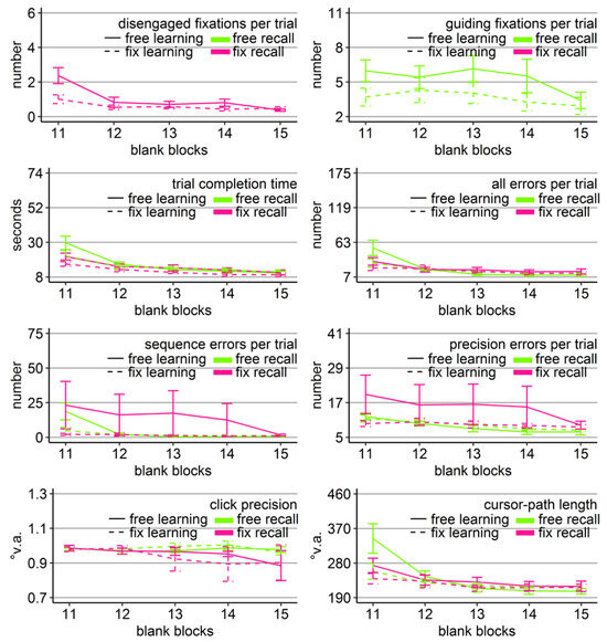 The block effects of the three-way ANOVAs were mostly due to performance improvements over the course of the recall phase of both learning groups, indicated by linear trends (time: ps < .001; all errors: ps < .01; sequence errors: p < .04; precision errors: p < .001 for free learning group and p = .10 for the fix learning group; path: p < .001 for the free learning group and p = 0.08 for the fix learning group).