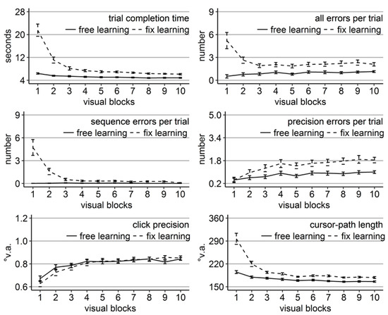 Performance measures during the learning phase of Experiment 1: Trial completion time in seconds, numbers of all errors, sequence errors, and precision errors per trial, click precision in °v.a., and cursor-path length in °v.a. (y-axes) over the course of the ten visual blocks (x-axes) for the two learning groups (free gaze as solid line and fix gaze as dashed line). Error bars represent standard errors of the mean.