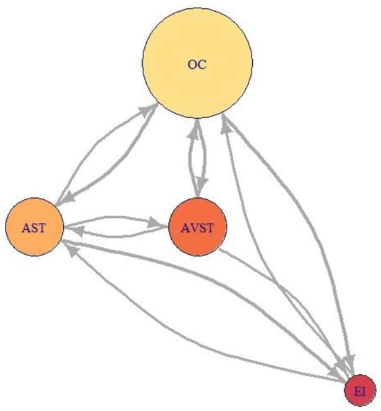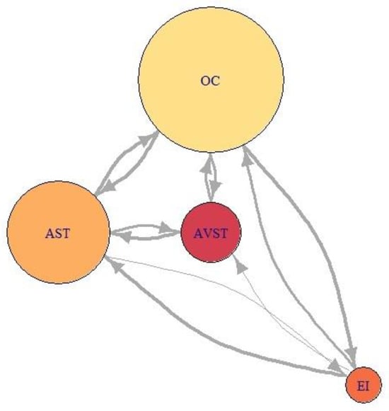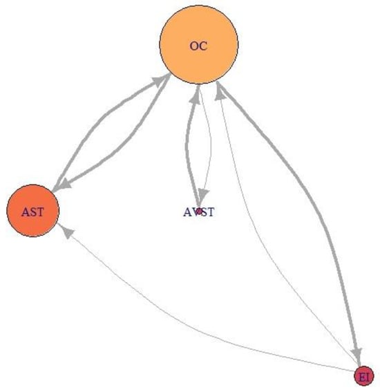 Figure 21, Figure 22 and Figure 23 represent network visualization of the EM data for three participants during Climb phase of flight, for all four AOIs. In Figure 21 AOI AST is the primary one for participant P2 since it has most EF numbers (circle size) and longest EF duration (circle color), closely followed by OC AOI. AVST AOI is substantially less important, whilst EI AOI has almost no importance.