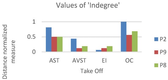 Examining relative importance measures of AOIs for each participant across five flight phases in Figure 24 a) to e) shows some trends for each participant, thus suggesting the presence of saccade strategies. High-performance participant P2 had high indegree and closeness values for AST and OC AOIs, on the other hand, his betweenness values for AST AOI were insignificant, except in the case of landing (Figure 24 e)). His betweenness values for OC AOI were constant. We should take into account that participant P2, according to Table 6, had the highest number of fixations. Since Figure 21 (P2) revealed that the EF durations were not high, the duration of gazes was most probably very short. If we take into account that only this participant gave advance to AOI AST, we can conclude that he had specific saccade strategy.