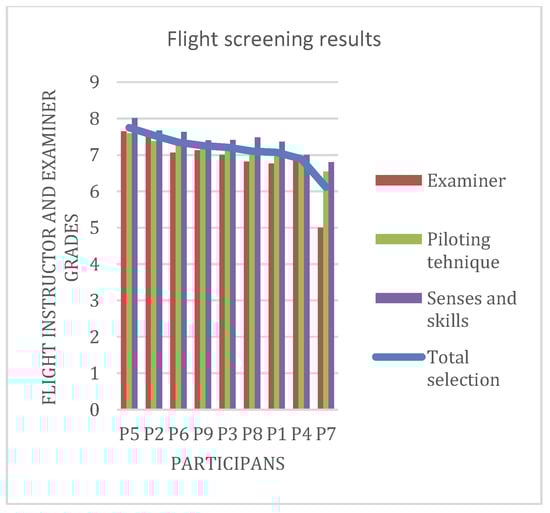 According to the selection process (Figure 4), candidates who passed the psychological selection moved to the next step, the initial flight training, as the central part of the flight screening selection. The assessment during the initial flight training includes the grades (range 5 to 10) given by the flight instructors and flight examiners during ground training and in-flight evaluation. It consists of the candidate assessment regarding the senses and skills necessary for flying and piloting skills in the air.