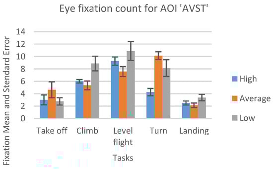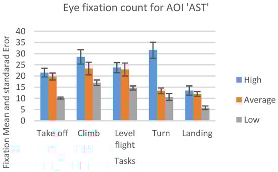 In the reference literature, it is said by Katoh [41] that the pilots exhibited the shortest dwell times during landing. This finding suggests that visual scanning patterns during landing are distinctly different from other periods of flight. Regarding fixations count, bars inside the Charts that represent number of fixations during landing phase inside AOI AST (Figure 13) and inside AOI OC (Figure 15) are indicating the same. Katoh [41] also suggested that landings should require the attention of both instruments and the outside view. Hence, pilots must have more active visual scan patterns. The confirmation of an active scan patterns hypothesis might be the number of revisits given in Figure 17 and Figure 18.