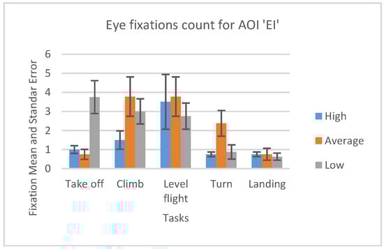 The number of fixations inside EI AOI is insignificant in absolute and relative number. It is represented in Figure 16. This fact was another confirmation that the participants were untrained beginner pilots (skilled pilots would pay more attention to engine parameters). This information can be a future reference for the evaluation of sorties in the flight simulator.