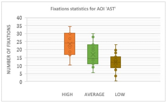 Results presented in the form of box and whiskers in Figure 19 confirm that the High-performance participants had the statistically most significant number of fixations inside AST AOI.