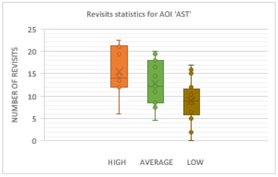 In case of number of Revisits One-way ANOVA, again, revealed significant differences between groups in number of revisits inside AST AOI (F(3.2199) = 6.7093, p < 0.01). Separate independent T tests between groups revealed significant difference between Highperformance participants (M = 15.532, SD = 5.11) and Low-performance participants (M = 9.0245, SD = 4.24) (t[3.566] = 2.048 p < 0.01) and no significant difference between High-performance participants (M=15.532, SD = 5.11) and Average-performance participants (M = 12.9046; SD = 4.85), (t(1.24405)=2.0686, p = 0.2260). The comparison between Average-performance participants and Low-performance participants revealed that the Average one with (M = 12.9046, SD = 4.85), had statistically significant greater number of revisits then Low-performance participants (M = 9.0245, SD = 4.24), (t[2.4428] = 2.0345 p < 0.02).