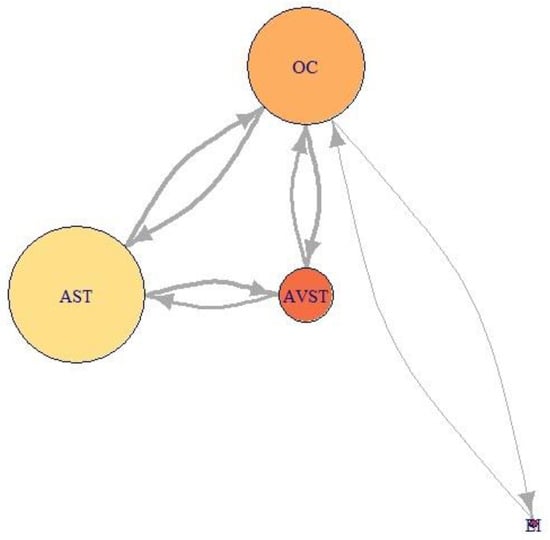 For the Average-performance participant P9 (Figure 22) AOI OC is the primary one. Two AOIs, AST and AVST are considerably less important. AVST AOI has a shorter EF duration then EI AOI on the other hand, AST has longer EF durations and greater EF numbers. Unlike in the previous case, AOI EI possess some importance for participant P9. Figure 23 shows that primary AOI for participant P8 was AOI OC. Compared with previous cases this is the least important “primary AOI” since it has least EF numbers (circle size), and shortest EF durations (circle color). In this case, AOI AST is of secondary importance, with two other AOIs disregarded. Figure 21 through 23 also shows that there is a difference in the number of EF transition between some AOIs and that some connection between AOIs does not exist for some participants.
