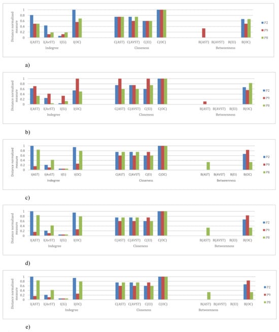 Participant P9 was trying to spread his attention evenly across all AOIs, which is evident from Figure 22 (P9). Figure 24 a) to e) shows that he had the highest levels of indegree and closeness for all AOIs across all flight phases (except for indegree during the turn). His centrality values are almost identical for observed AOI across all flight phases, apart from being high. He also managed to reach some values of betweenness for AST AOI. His saccade strategy is also distinguishable.