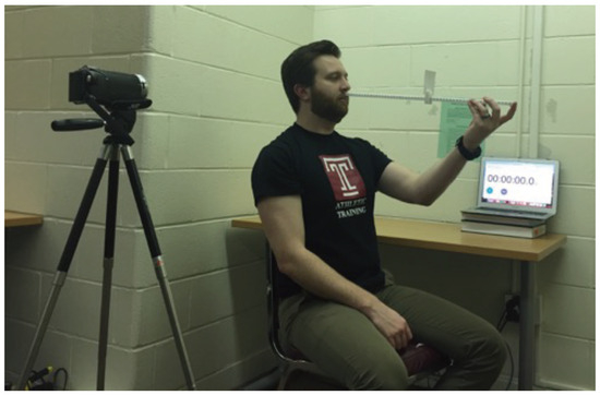 A digital camera mounted on a tri-pod was used to confirm accuracy in hitting the desired target speeds. The camera was set up to the right of the participant such that it could capture that tic marks on the ruler as well as the digital stopwatch in the background of the image (Figure 2). Video of the trials was reviewed after data collections so that target speeds could be calculated by reviewing the start and end-point of the target as well as the time elapsed during the trial. The self-paced trial was performed in a similar manner, except the target was moved at a self-determined pace that was comfortable for participant. These trials were also recorded so that target speed could be calculated.