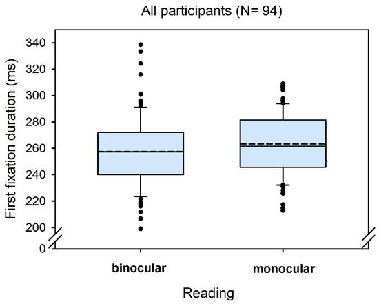 Overall, we found an average binocular advantage of 6 ms (SD = 18) across all 94 participants. Figure 1 shows the corresponding boxplots for monocular and binocular first fixation durations, respectively. The statistical analysis showed a corresponding significant effect for the fixed effect of reading condition (see Table 1).