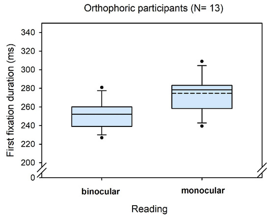 Boxplots for first fixation duration in monocular and binocular reading for orthophoric participants only.