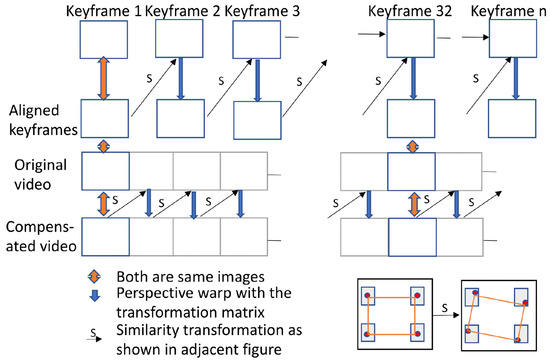 We elected to realign to a new keyframe once every 480 frames (5 s). Less frequent realignment increased the aggregated skew and perspective errors, and more frequent realignment increased the frequency of the jitter. The overall model is shown in Figure 7.