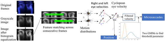 To automatically adapt to individual observers, we implemented an adaptive-threshold method based on a Gaussian mixture model (GMM) with two velocity distributions representing noise and microsaccades. To eliminate larger saccades, only absolute velocities below 20 deg/sec were passed to the model. A thresholding parameter based on estimated mean and standard deviation using 99.7% of each distribution was used. Based on observations of the noise floor, a lower bound of 3.84 deg/sec was selected to minimize false alarms. Figure 8 shows the block diagram from the iris feature extraction to microsaccade detection.