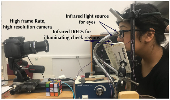 Binocular eye movements were recorded using a Panasonic Lumix DMC-GH4 mirrorless digital camera modified by removing the IR-rejection filter. Video recordings of the eyes and the region surrounding the eyes were recorded at a frame rate of 96 frames per second (fps). Head movements were restricted with a UHCOTech HeadSpot chin and forehead rest. Filtered tungsten and LED infrared light sources were used to illuminate the eyes and the region surrounding the eyes as shown in Figure 9. Subjects were asked to sit comfortably to minimize head movements. Trials were repeated until calibration was completed without blinks.
