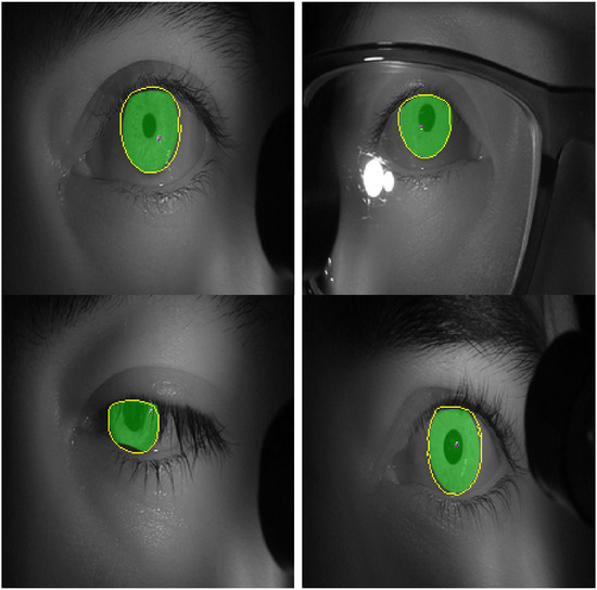 Figure 11 shows images with iris regions predicted by the model and ground truth indicated in yellow and green colors respectively. For proper visualization, only the border predicted by the model is shown. The large white regions in the upper-right image are specular reflections in the observer’s eyeglasses. A spike in the loss function at epochs 16-17 evident in Figure 10 is because of inconsistency in some of the labeled data such as when the eyelids cover the iris as seen in the lower left image in Figure 11.