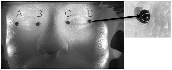 Face model used for head stabilization verification with markers A, B, C and D indicated in the figure (Left). (Right) The circle indicates the bright spot used for our method verification.