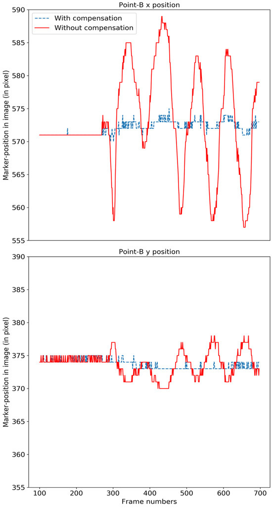 The motion of the original face model (red) and after compensation (blue) for point B is shown in the x-direction (top) and y-direction (bottom). .
