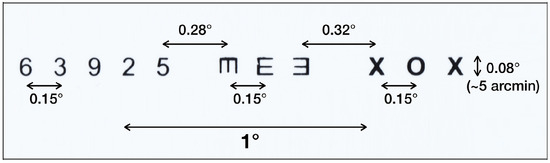 Target line from pocket Snellen chart. Characters in three groups subtended a vertical angle of 5 arc minutes.