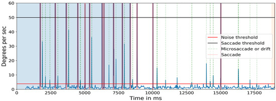 Absolute velocity (deg/sec) of the cyclopean gaze. Light green shows the small eye movements detected between 3.84 deg/sec to 50 deg/sec. There should be at least eight 0.15-degrees, one 0.28-degrees, and one 0.32-degrees, a total of 10 movements after 8500ms (in the non-highlighted region) as targets in one line of the Snellen chart. The initial 8500ms are the calibration phase.