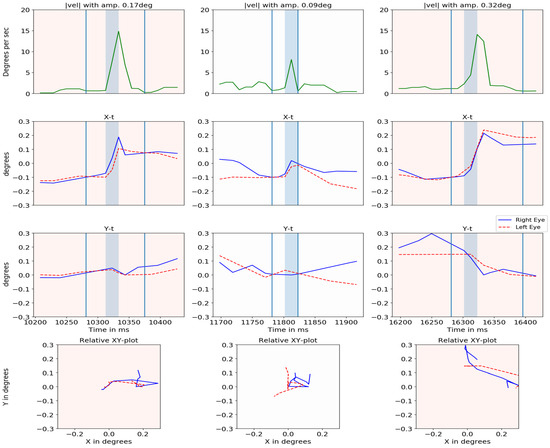 Figure 16 plots the absolute velocity of the cyclopean gaze (with its amplitude), X-t, Y-t and YX graphs for both eyes when microsaccades were detected. The amplitude of each microsaccade was calculated based on the gaze position between the local minima of the cyclopean velocity before and after the microsaccades. The two local minima are indicated in the absolute velocity plot by the vertical light blue lines. There is a close relationship between the two eyes for most of the cases. The center column shows a case where the eyes were moving in opposite directions.