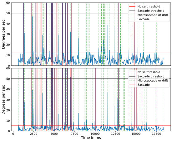Absolute velocity (deg/sec) of the cyclopean gaze plotted for subject 5 for both without head compensation (top) and after head compensation (bottom). Light green shows the small eye movements detected for their respective threshold parameter.
