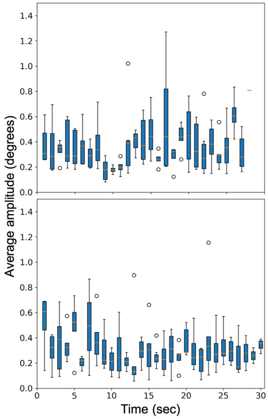 In the second video task, the observers viewed a ‘shell game’ with three cups and one marble and were instructed to follow the cup that contained the marble. The visual task induced smooth pursuit, saccades, fixations, and microsaccades. The box plot with the number of microsaccades detected per second and the variation of the rate of microsaccades among different subjects is plotted for all subjects in Figure 19 (bottom row). Figure 20 compares the average amplitude of the microsaccades over the entire video for the two video tasks.