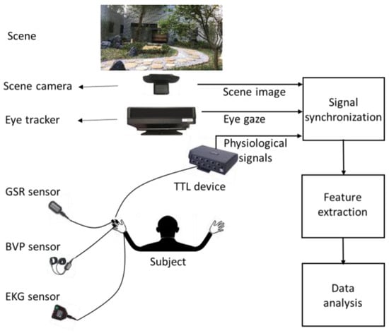 While the design principles and the calming effects of Japanese gardens are well established, the ways in which viewers interact visually with the garden, and how this interaction might lead to the calming effects of Japanese gardens has not been well studied. To address this issue, we developed a measurement system enabling us to track a subject's gaze non-intrusively and to record their physiological signals simultaneously (Liu, Herrup, & Shi, 2017; Liu, Zhang, Goto, et al., 2018; Liu, Zhang, Herrup, & Shi, 2018). The physiological signals measured are the electrocardiogram, the blood volume pulse and the galvanic skin response. To our knowledge, this is the first system enabling simultaneous monitoring subjects' visual interaction with a real 3D environment and their physiological responses.