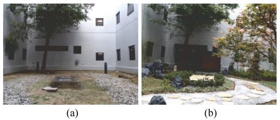 Figure 2 (a) and (b) shows photographs of the two scenes viewed by the participants. Both scenes were of the same physical space (16.5m × 10.1m area), but landscaped in two different ways. This ensured that most conditions for the two scenes were the same, except for the visual content.