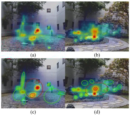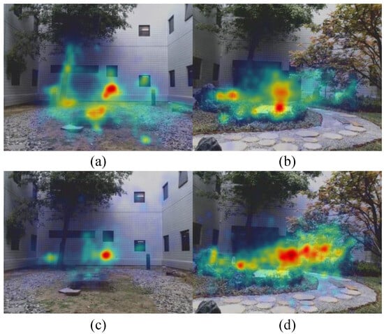 The first row shows measured gaze heat maps when viewing directly (a) the simple courtyard and (b) the Japanese garden. The second row shows measured gaze heat maps when viewing projected photographs of (c) the simple courtyard and (d) the Japanese garden viewing. Red/blue indicates more/less frequent eye gaze.