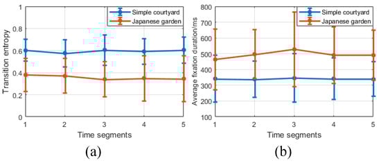 Plots of transition entropy (a) and fixation duration (b) averaged across all subjects versus time in simple courtyard and the Japanese garden. Error bars indicate standard deviation.