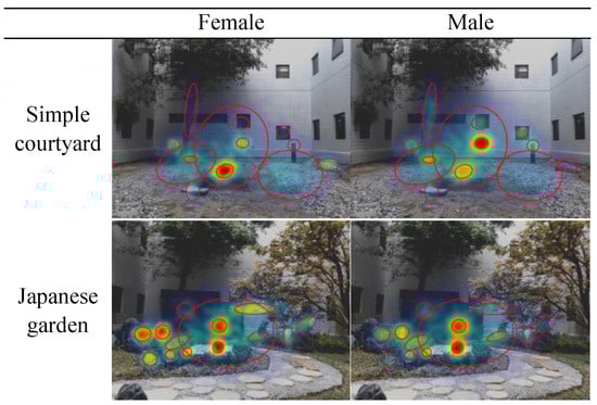 Figure 5 compares gaze heat maps generated by the female and male GMMs. When viewing the simple courtyard, females focus more on the central concrete block, whereas males focus more on the water hose attached to the wall. In the Japanese garden, females and males both spend considerable amounts of time gazing at the tatami mat covering the concrete block and at the bench in the center of the scene. However, females spend a larger proportion of time also gazing at points in the periphery, both in the simple courtyard and in the Japanese garden, leading to more spatially distributed gaze maps.