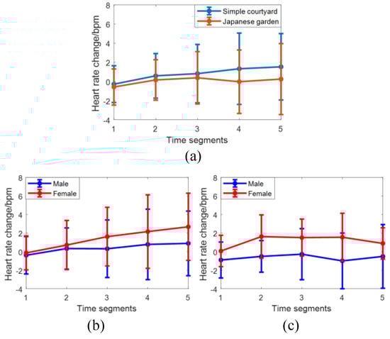 We observed a significant effect of gender for ΔHR (p = 0.05, effect size = 0.06), but not for ΔRMSSD and ΔSCL . Figure 6(b) compares the average ΔHR over for female and male subjects in the simple courtyard. The average heart rate of the female subjects increased steadily over the viewing period, whereas the average heart rate of the male subjects remained relatively constant over time. Figure 6(c) compares the average ΔHR in the Japanese garden. When viewing the Japanese garden, the average heart rates of both female and male subjects remained relatively constant over time. However, consistent with the results in the simple courtyard, the ΔHR of female was higher than for male subjects. Our results suggest that female subjects felt more stress in both environments.