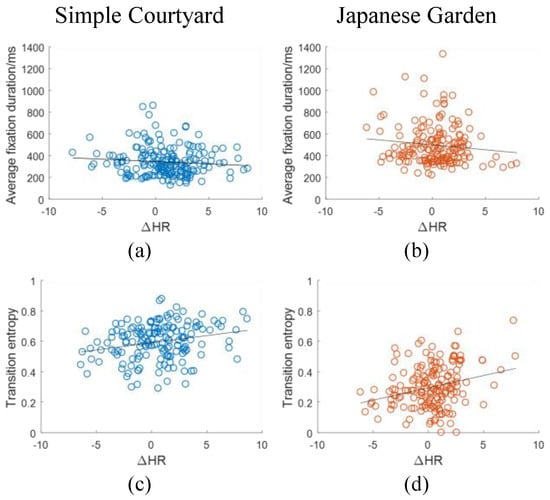 Scatter plots of the average fixation duration (a,b) (top row) and the transition entropy (c,d) (bottom row) versus the ΔHR for the simple courtyard (a,c) (left column) and the Japanese garden (b,d) (right column). Each dot represents the data calculated from one 3-minute interval of viewing.