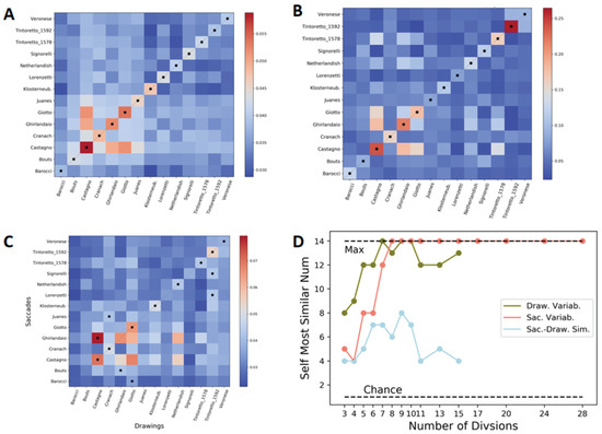 Comparison across paintings as method validation. The similarity across different paintings is shown on A-C, with black dots marking the most similar painting for each row (red = higher similarity). A) Saccade Variability. Eg: the 14 cells in the first row represent similarity between all saccades of the Veronese painting compared to all of the saccades for each of the 14 paintings (across different observers). B) Drawing Variability, the same as A but for drawings. C) Saccade-Drawing Similarity (x-axis: drawings, y-axis: saccades). Cells in the first row show the similarity of all saccades for the Veronese compared to the compositional drawings of all 14 paintings. D) This figure shows the combined number of self-similar paintings (number of black dots falling on diagonal in A-C) for the 3 measures for the different number of divisions (x-axis), where the most similar set of saccades/drawings are the ones for the same paintings.