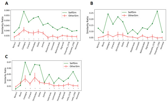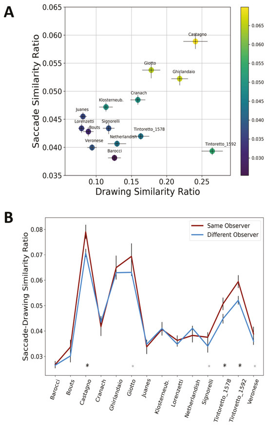 Overall, as with saccade to saccade comparisons, the works by Castagno, Giotto and Ghirlandaio had the highest, and Barocci the lowest, similarity ratios in the comparison of saccades and drawings (Figure 3C, Figure 4A). The similarities between Castagno, Giotto and Ghirlandaio were significantly above, and the similarity of Barocci was below all other paintings (p<.001, all 46 comparisons).