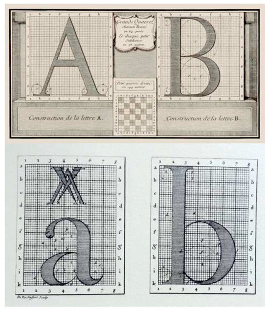 Pioneers in the field, masters Nicholas Jenson and Francesco Griffo, used the proportions of Roman square capitals to shape and cut the letters of the first Roman typefaces. The main challenge they, and other Roman typeface designers, were faced with was how to align the Humanistic minuscule with the Roman square capitals. For, whereas the latter, angular and geometric, was based on the Greek capitals, the former was developed from handwritten letterforms, making the harmonisation of these two an issue to be solved through the coming centuries and a succession of different Roman type designs. Developed in 1698, Romain du Roi (French: “King’s Roman”) typeface, served as a breakthrough, of a kind, by managing to successfully bring the majuscule and miniscule letters together. It became a model of new proportions, where the lowercase letters were appended to the uppercase ones by being systematically constructed on the same principles (Figure 1).