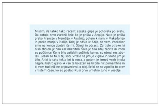 The text for the reading speed test 1 contained 156 words, i.e., 647 characters excluding spaces. The text for the reading speed test 2 contained 148 words, i.e., 656 characters excluding spaces. The passages were written in Slovenian language, and were excerpts from Ela Peroci’s children book “For good night.” The texts used for testing the exposure period were copied from a Slovenian lifestyle magazine and were about popular music, film and technology.
