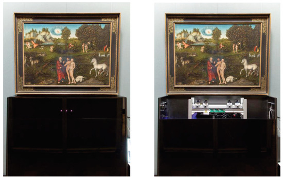 A view of the painting as seen through the participant’s viewing window. The concealed eye tracker was placed under the painting and covered by plexiglass (left). Inside, four cameras monitored the viewing window (right). Lucas Cranach, Paradise, 1529.