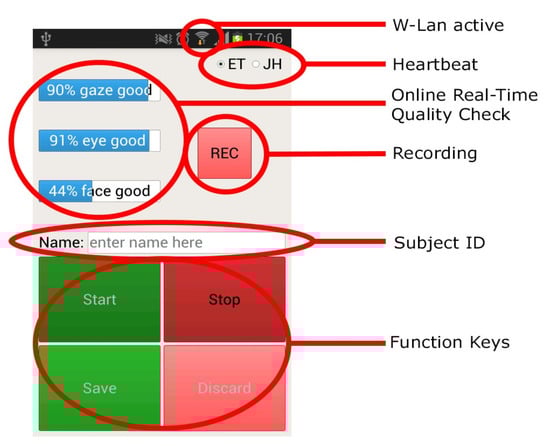 A screenshot of the mobile phone application interface. It allowed the researchers to remotely start and stop the recording process, save or discard the recorded data based on participant consent, enter the participant ID, check the recording quality, and ensure continuous connection to the gaze tracker through the W-Lan and “Heartbeat” signal from the gaze tracker (ET) and the job handler (JH).