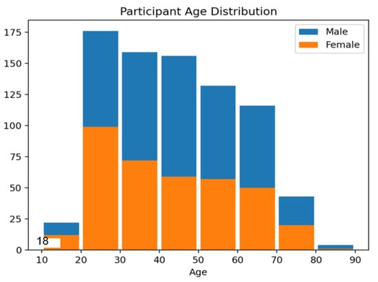 All of the participants were independent museum visitors, not brought to the museum especially for the study. Over the course of four weeks, 808 participants over 18 years of age took part in the study (54.86% male, sd=15.93). Nearly half were visiting the museum for the first time. A questionnaire was available in German, English and Japanese. A breakdown of age and sex can be seen in Figure 5. The majority of participants, 77%, had some higher education and 72% had no knowledge of the paintings in the study prior to their visit.