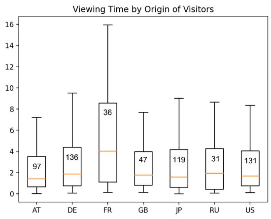 One of the goals of the study was to include visitors’ different backgrounds, such as culture and gender, into the analysis and look for viewing behavioral differences between groups. The study included participants from 60 different countries. The top seven (with 30 participants or more) were, in descending order: Germany (DE), Japan (JP), USA (US), Austria (AT), Great Britain (GB), Russia (RU) and France (FR). These seven countries represent 65% of all participants. An ANOVA and follow-up t-tests revealed that only one group is significantly different from the others: the French viewed the paintings significantly (p<0.0008, d=0.6) longer than others (Figure 7).