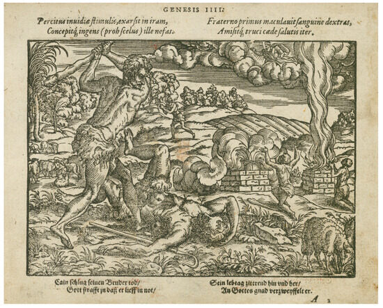 - Image 3 | Genesis IV (IIII) (page 15) depicts Cain murdering his brother Abel. Text in English: Cain beat his brother to death / God punishes him so he ran into distress / His life-time back and forth / He despairs of God's grace