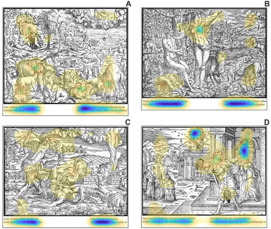 The analysis of saliencies clearly shows that the texts are the most attractive elements in all images, i.e. the dark blue color indicates their highest probability density. Such finding is to be expected, since the DeepGaze II saliency model has also learned to incorporate text as high-level (feature) object (Kummerer et al., 2018). With a much lower amount of probability density, regions within the images were quantified. Some of these regions overlap with the ROIs, which we have chosen because of their importance in reflecting the narratives. However, identified saliencies also highlight regions that have no reference to the narrative supported by the text. For instance, the lower area of image 1 (Genesis I) was rated as salient, but the highlighted objects (animals; see Figure 5A) were not part of the semantical content of the text.