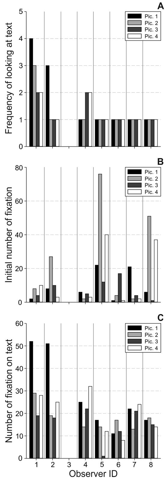 Measures related to the overall use of text: A) Frequency of looking at text, B) Initial number of fixation, and C) Number of fixation on text analyzed for each observer (abscissa) and image 1-4.
