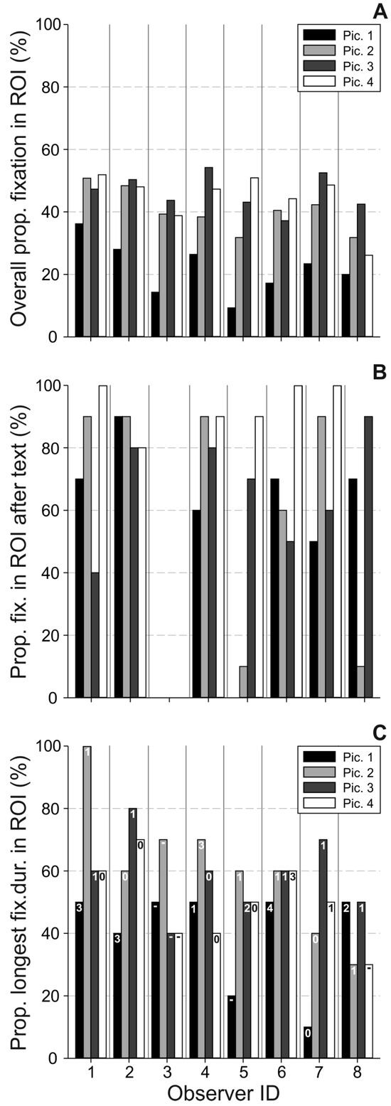Measures related to the relevance of ROIs & text interaction: A) Overall proportion of fixation in ROI, B) Proportion of fixations in ROI after text, and C) pro-portion of longest fixation duration in ROI (numbers indicate the amount of longest fixations, which occurred directly after text-scanning) analyzed for each observer (abscissa) and image 1-4.