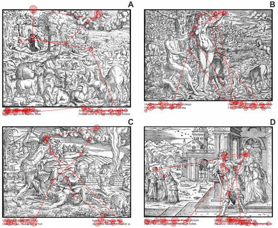 Partial scanpaths of an exemplary observer (ID 1) shown for all stimulus images: A) Image 1 | Genesis I (page 13), B) Image 2 | Genesis III (page 14), C) Image 3 | Genesis IV (IIII) (page 15), and D) Image 4 | Genesis XXXIX (page 27). The first ten fixations following the initial text-scanning period are plotted together with the complete scanning of the text. The scanpaths contain the spatiotemporal sequence of fixations (red circles with black edges; size of the red circles illustrates fixation duration) and saccades (red lines).