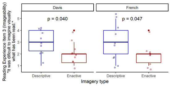 Results for Item 3 (Imageability) of the Reading Experience Questionnaire. Note. Wilcoxon singed-rank test showed significant differences between Descriptive (blue) and Enactive (red) texts within both text pairs (Davis (left two boxplots) and French (right two boxplots)).