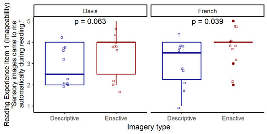 Results for Item 1 (Imageability) of the Reading Experience Questionnaire. Note. Wilcoxon singed-rank test showed significant difference between descriptive (blue) and enactive (red) texts within the French text pairs (right two boxplots) and trend within the Davis texts (left two boxplots).