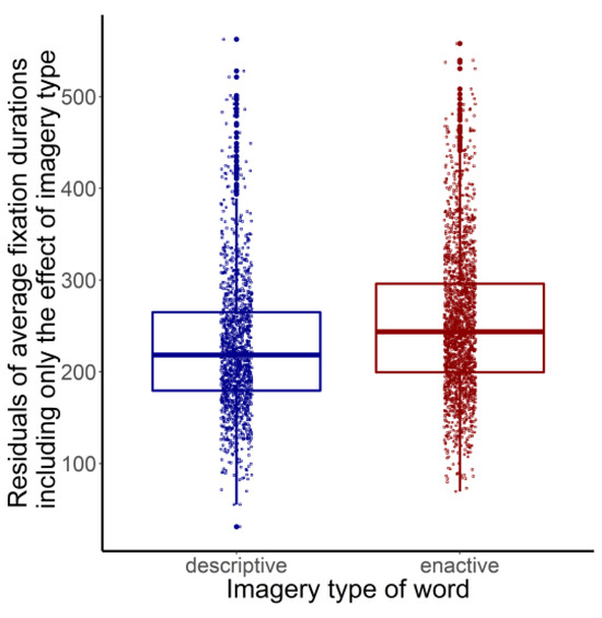 Second, we analysed different duration based measures at word-level. For these analyses, we used only the Davis text-pair. As reported later in the analysis of the reader experience ratings, the self-reported reading experiences of the Enactive and Descriptive Texts of the French text-pair differ from each other not only for imagebility related items but also for other sub-scales like suspense and coherence. We assume that the effect of imagery style on eye movements might be better understood when only the more homogenous Davis text-pair is examined. For the analysis at word level, we therefore included only those words from the Davis texts 1) which belonged to a text-part indicated by our expert as prompting enactive or descriptive imagery [(see Study I), 2] which were verbs, nouns or adjectives and 3) which were fixated. To get a detailed picture we analysed mean fixation duration (mean duration of all fixations on the words satisfying the above mentioned criteria) as a general indicator of reading behaviour, first fixation duration, and gaze duration (sum of fixation durations at the first visit) , two measures associated with early and more automatic processes of lexical processing, and dwell time (sum of all fixations and saccades of all visits on a word), a measure associated with both early and later processes like deeper semantic processing, reanalysis and integration (e.g., [33,53]). Due to technical reasons, gaze duration was calculated for words with one visit and for words with more visits if the number of fixations were not more than the number of visits +1. Therefore, 92% of the gaze duration was analysed.