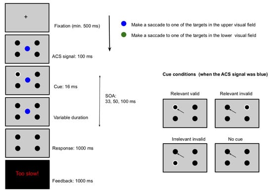 The experiment began with a 9-point calibration. Each trial started with a fixation cross surrounded by four black filled circles of diameter 0.8° on a grey background (CIE-Lab: 63.33, 0.00, -0.00). A fixation trigger was used to ensure that the display did not move to the next screen unless the participant fixated on the cross for a minimum of 500 ms. The four circles were placed 7° from the centre and were equidistant from each other (Figure 1). This was followed by a central coloured circle of diameter 1° (blue CIE-Lab: 22.83, 58.29, -94.73 or green CIE-Lab: 37.08, -40.51, 41.55). The coloured circles henceforth referred to as “ACS signal” indicated the relevant visual field for the participants on that trial. For instance, a blue circle indicated that the participants had to make a saccade to one of the two circles in the upper visual field. The green circle indicated that one of the two circles in the lower visual field were the targets. The mapping between the colour of the ACS signal and the visual field was counterbalanced across participants. Next, the outline of one of the four black circles turned white for 16 ms, acting as the cue. The cue appeared in one of the two relevant locations on one-third of the trials and in one of the two irrelevant locations on the other one-third of the trials. The cue was equally likely to appear at each of the four locations. On the remaining one-third of the trials, no cue was presented. A display screen consisting of the central coloured circle and the four black circles was then presented for a variable duration of 17, 33 or 84 ms following which the ACS signal disappeared at which stage the participants were required to make their response. Thus, there were three levels of SOA between cue onset and the offset of the ACS signal: 33 ms, 50 ms, and 100 ms.